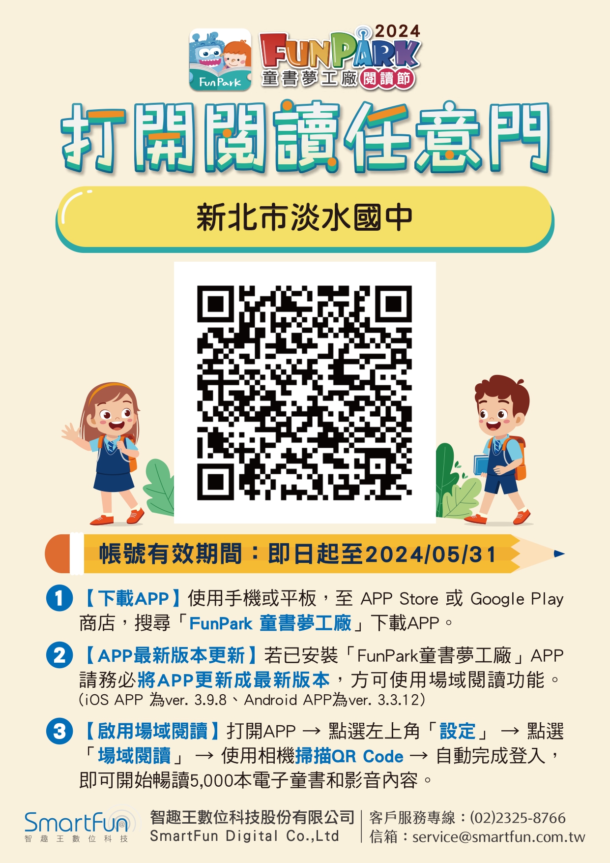 二、FunPark童書夢工廠為響應4月23日世界閱讀日,於113年4月2日至5月12日舉辦FunPark「打開閱讀任意門」系列活動,包含「百大童書大賞」、「閱讀獎勵任務」、「名人好書導讀主題專區」、「申請場域閱讀」以及「校際閱讀競賽」等,期盼透過多元活動,推廣閱讀風氣,提升全民閱讀素養重要性。